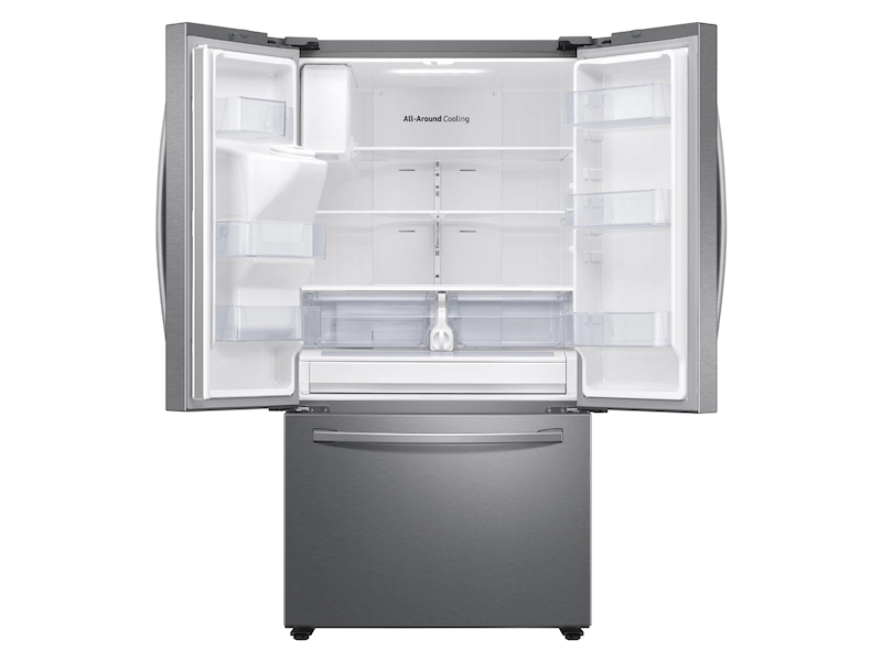 Samsung??s 27 cu. ft. large capacity 3-Door French Door refrigerator is beautifully designed, with a minimal dispenser, sleek-edge doors, and modern handles. The clean lines and distinct form blend beautifully into your kitchen while the fingerprint resistant finish withstands everyday smudges.